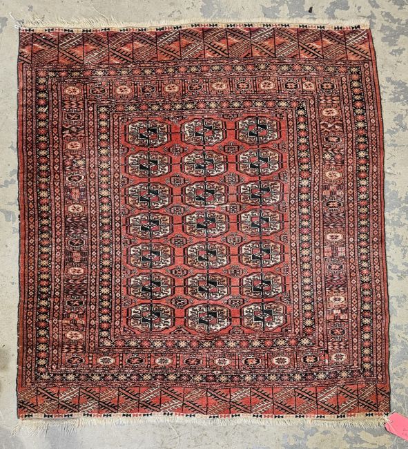 Eastern red ground rug with three rows of seven elephant foot guls, multiple geometric borders 123cm x 113cm
