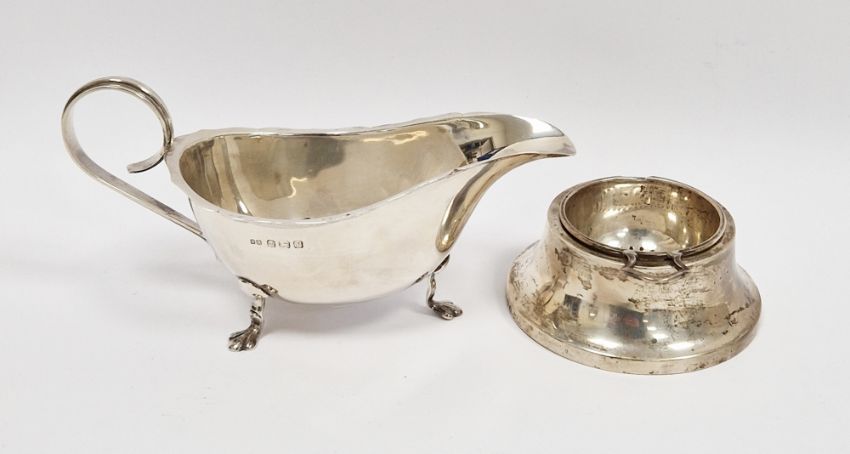 Silver sauceboat, Birmingham 1939, John Rose, of oval form with loop handle and raised on three paw feet, 15cm long together with a silver tea strainer, Birmingham 1933, makers marks rubbed, strainer lacking one handle, approximate total weight 4.02ozt