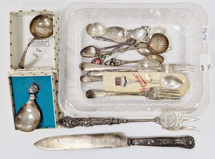 George V silver bread fork and pickle fork, both Sheffield 1913, Walker & Hall, bread fork 23cm long, Victorian silver handled bread knife, boxed Elizabeth II silver ' Silver Jubilee ' caddy spoon, Birmingham 1977 together with a collection of silver and white metal flatware including a Chinese white metal teaspoon with figural finial and shell bowl