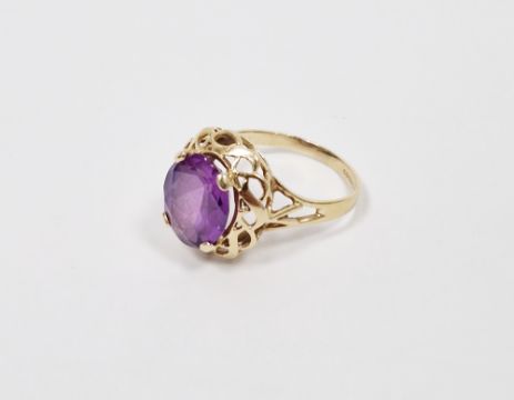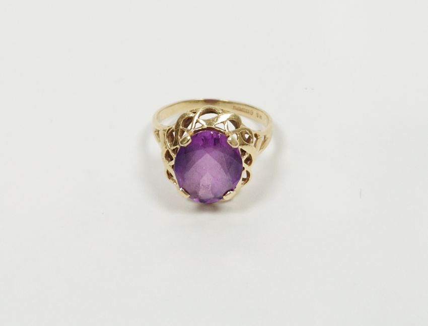 14K gold and purple stone ring, the oval stone in scroll bordered mount (size P)