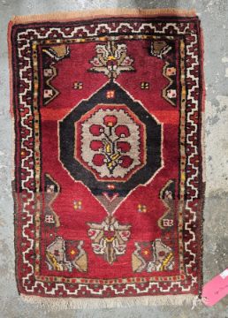 Eastern red ground rug with three central lozenge medallions flanked by two rows of four elephant foot guls, multiple geometric borders 120cm x 93cm together with a smaller red ground rug with central lozenge medallion, multiple geometric borders, 79cm x 54cm
