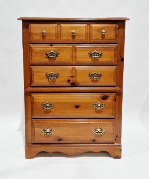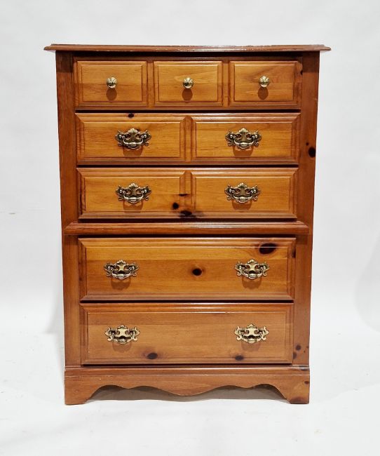 American Broyhill Furniture stained pine chest of five long drawers, the top drawer with three brass knob handles and the remaining drawers with two swan neck brass handles with shaped backplates, raised on bracket feet, 86cm wide x 43cm deep x 117cm high