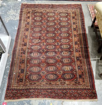 Bokhara-style Eastern wool rug, the red field with 11 rows of three octagonal guls and interspersed with lozenges (worn), 234cm x 146cm