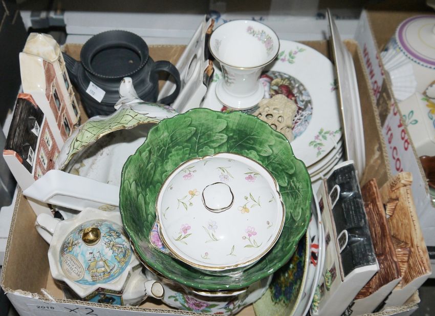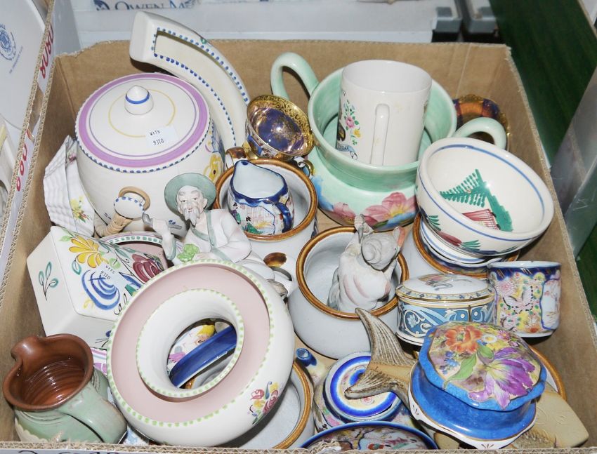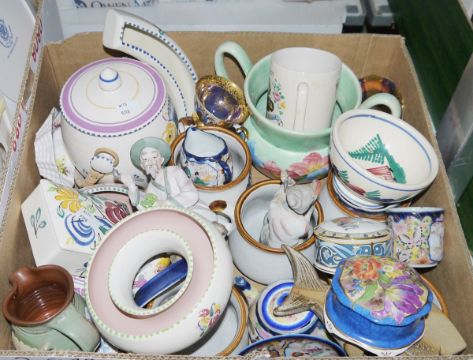 Floral decorated Poole lidded trinket box, similar bowl and handled jar, a Wedgwood Kutani Crane flower vase, a carved soapstone elephant and other items (2 boxes)