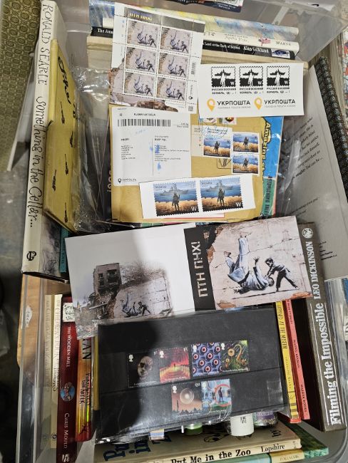Quantity of signed childrens books to include Lottie Prentice 'A Tale of Ted', Frank Cottrell Boyce 'Chitty Chitty Bang Bang Flies Again', Steve Backshall 'Ghosts of the Forest', Mary Hoffman 'Stravaganza City of Masks', Charman Hussey 'The Valley of Secrets', Paul Stewart and Chris Riddell 'The Edge Chronicles Freeglader together with other Childrens books to include Brain Selznick ' The Invention of Hugo Cabret, Corenella Funke Ghost Knight, etc and Banksy Ukrainian Stamps, postcard set