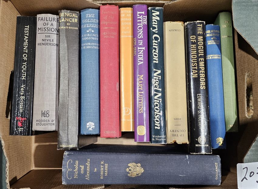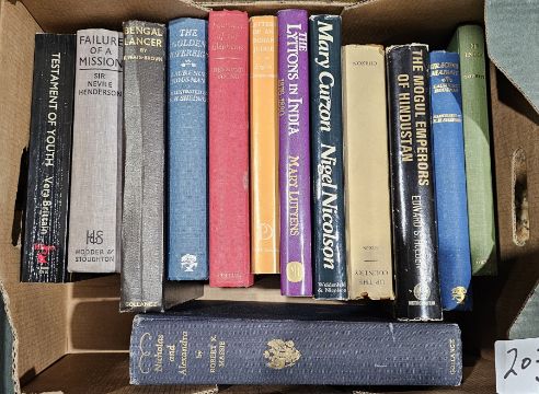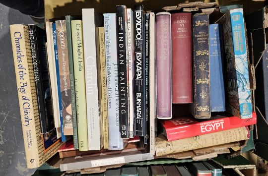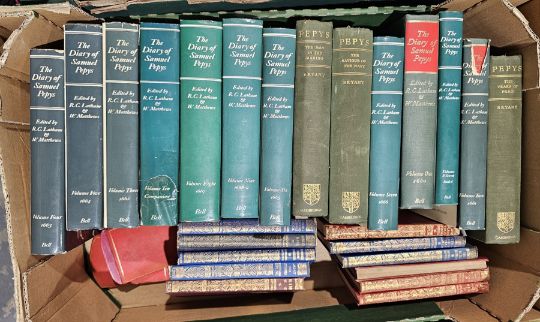 Latham, R C and Matthews, W (ed) "The Diary of Samuel Pepys", 11 vols, vol 1 without dust wrapper, Methuen leather vols, Rudyard Kipling, various books on art and art history to include publications by the V&A, Thames & Hudson, Waugh, Alec "The Mule on the Minaret ... Castle", 1965 dedicated and signed by the author, October 1965, dust wrapper which is rather chipped on the edges and other volumes (4 boxes)