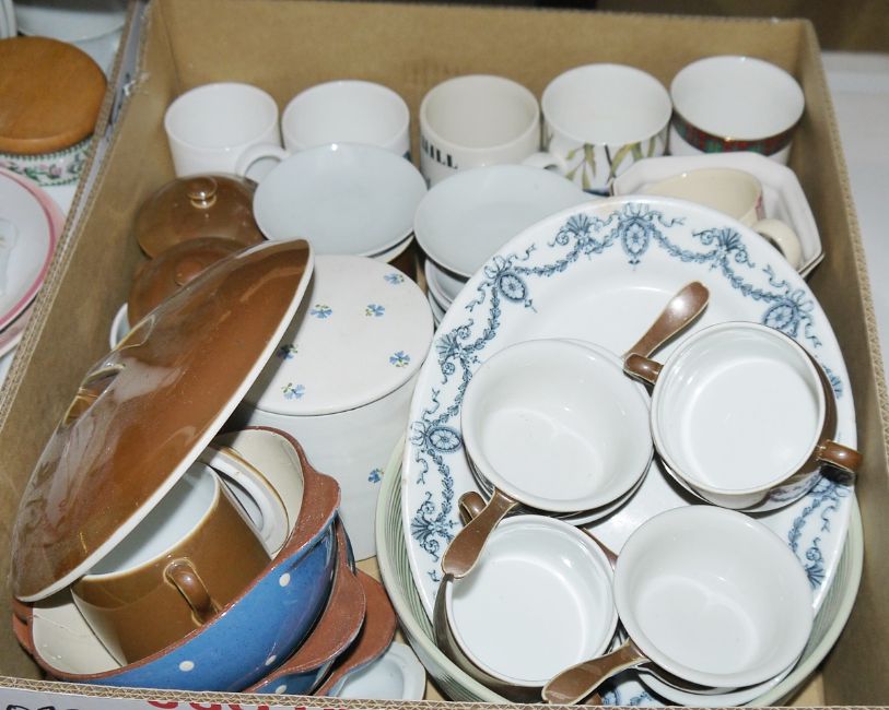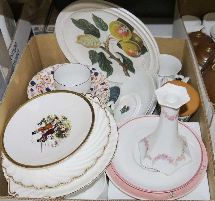 Portmeirion Susan Williams Ellis Variations lidded jar, two Portmeirion Pomona the Goddess of Fruit plates, a small collection of Royal Worcester brown glazed ceramics to include lidded pots, etc, an Aynsley part tea service, place mats and other items (3 boxes)