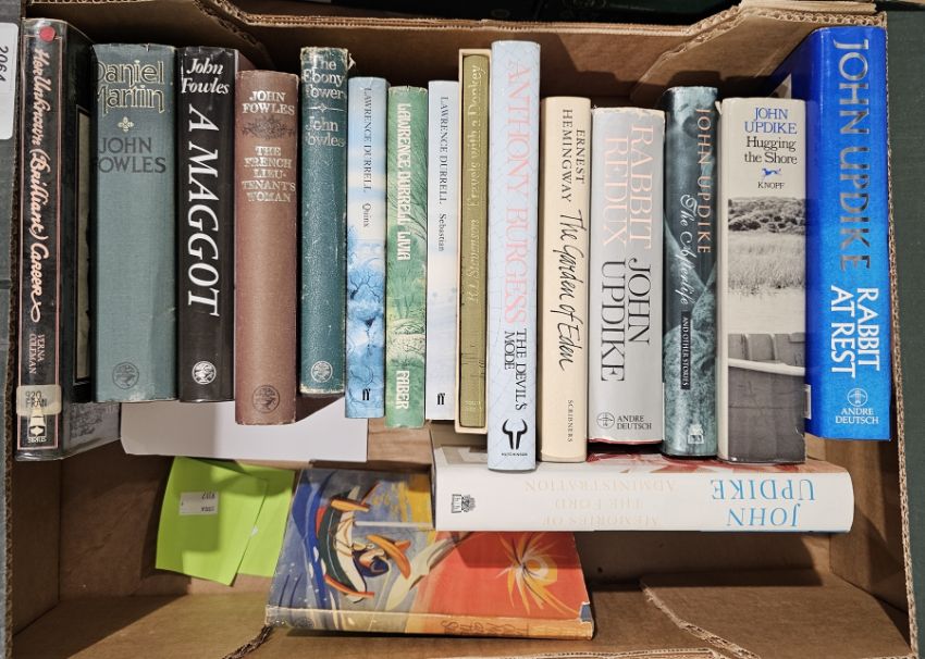 Modern first editions to include John Updike "Rabbit Redux" Andre Deutsch 1972, dust wrapper, "Rabbit at Rest" Andre Deutsch 1990 d-w, etc., Hemingway, Ernest "The Old Man and the Sea"  Jonathan Cape 1952, d-w, , "The Garden of Eden"  Scribners 1986 , d-w, Durrell, Lawrence "Quinx" "Livia" and "Sebastian" Faber and Faber, d-w , Fowles, John "The French Lieutenant's Woman" Jonathan Cape 1969, d-w, price clipped and inscription, and other volumes (1 box)