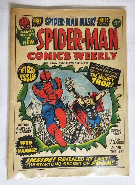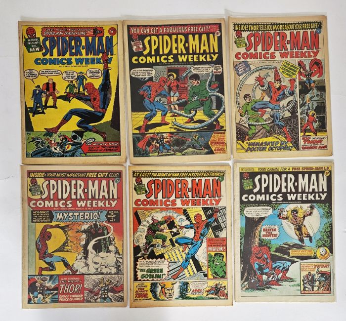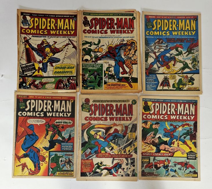 Marvel UK Spiderman Comics Weekly complete run #1-157, Super Spider-Man with the Super-Heroes #158-198, Super Spider-Man and the Titans #199-230, Super Spider-Man and Captain Britain #231-253 together with part run of Super Spiderman #254, 255, 258-261, 267-269, 274, 276, 278-281, 289-292, 296, 304