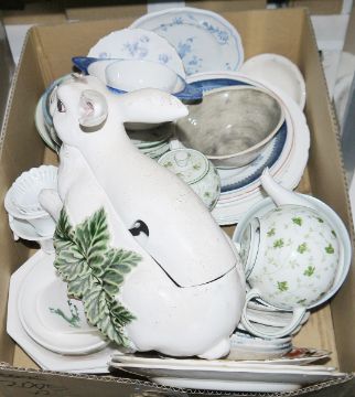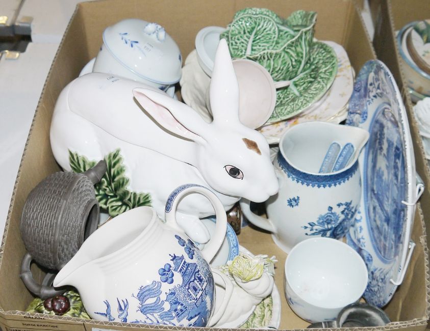 Pair of Portuguese rabbit-shaped tureens, a ceramic Chinese dark grey biscuitware osier teapot, a Warki ware South African studio pottery grey and cream glazed bowl, a small collection of French blue and white pottery and other items (2 boxes)