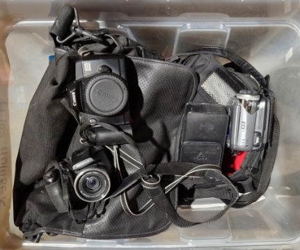 Canon EOS 5000 camera, a Fujifilm Finepix S5700 digital camera, a JVC Everio digital camcorder plus accessories