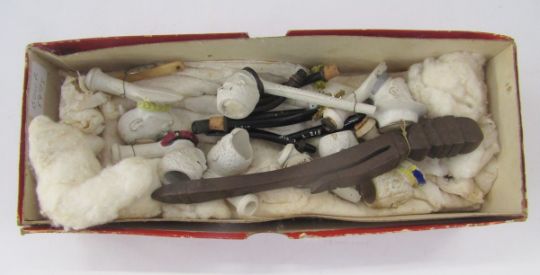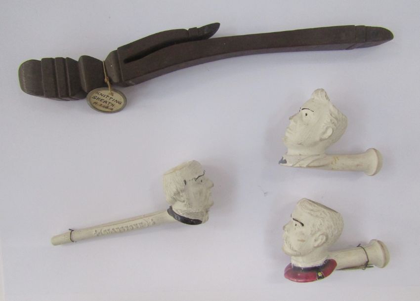 Quantity clay pipes to include character pipes, Lord Kitchener, General French, Gladstone, Lord Roberts and the King, a knitting sheath and other items