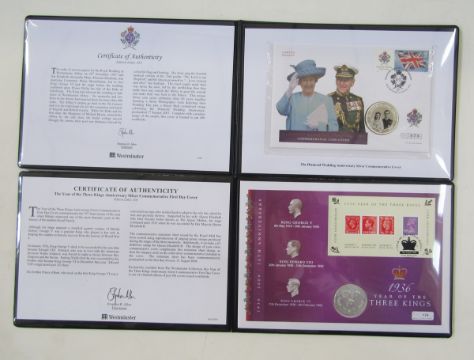 GB & World stamps: Large box of over 25 Westminster limited edition numismatic-philatelic covers including “Three kings” and Diamond Wedding silver coins and a “Centenary of scouting” collection of which 2 covers are numismatic, uncirculated condition.