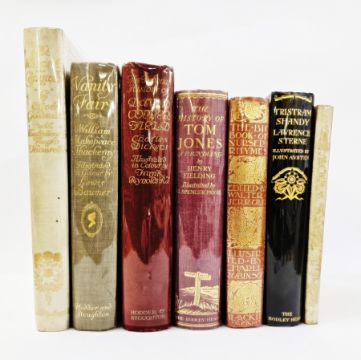 Thomson, Hugh "She Stoops to Conquer ...", by Oliver Goldsmith, Hodder & Stoughton, no.293 of 350 copies, numbered and signed by the artist, colour plates tipped in, full vellum with elaborate gilt decorations of roses, floral decoration and titles, with gilt and blue rules, ribbon ties not present Baumer, Lewis (ills) "Vanity Fair", Hodder & Stoughton, colour frontis tipped in, colour plates tipped in with lettered tissue guards, buckram with gilt titles and pictorial pastedown to front board  Reynolds, Frank (ills) "The Personal History of David Copperfield by Charles Dickens", Hodder & Stoughton, colour frontis tipped in, colour plates tipped in with lettered tissue guards, red cloth with gilt titles  Spencer Pryse, G ( ills.) "The History of Tom Jones ..., by Henry Fielding Esq" by John Lane, the Bodley Head 1930, plates, pictorial ep, purple cloth with pictorial gilt front board and gilt titles, glassine cover  Robinson, Charles (ills) "The Big Book of Nursery Rhymes edited by Walter Gerrold", Blackie & Son, colour plates, red blindstamped front cloth with blindstamped front board and gilt titles to backstrip Austen, John (ills) "The Life and Opinions of Tristram Shandy ...", John Lane, the Bodley Head 1928, illustrations throughout, bkpl inside front board, decorated ep, gilt decorated black cloth  "Souvenir of the First Anniversary Performance in London of the Universally Popular Play with Music, the Merry Widow ...", William Heinemann 1908, colour plates tipped in, pictorial boards (7)