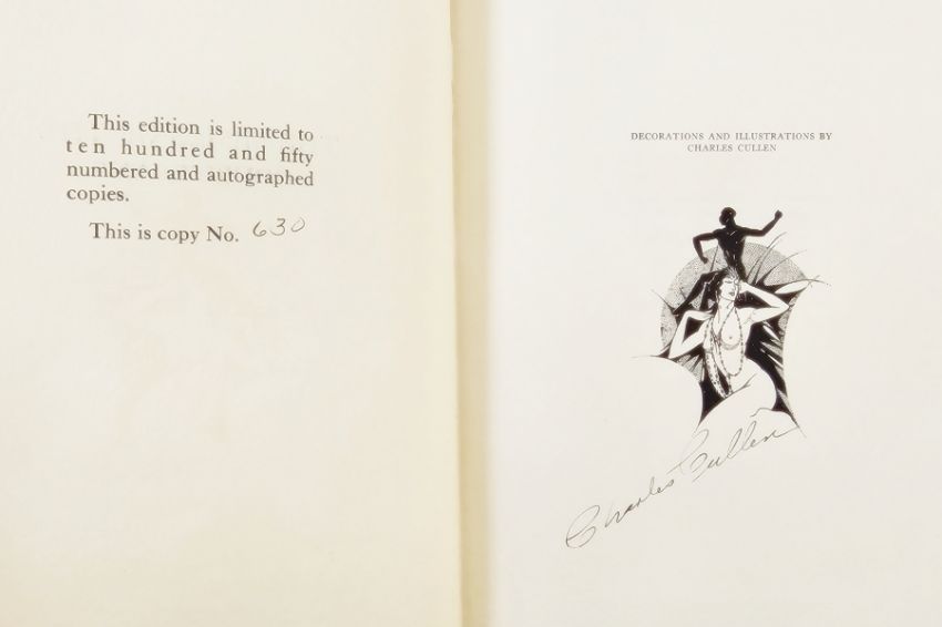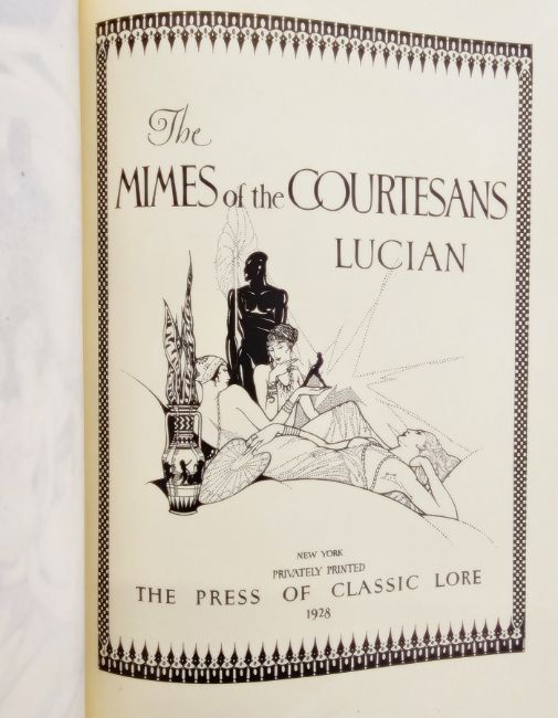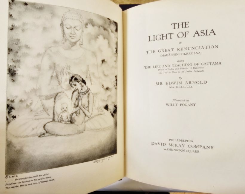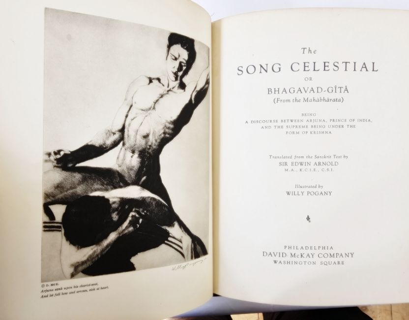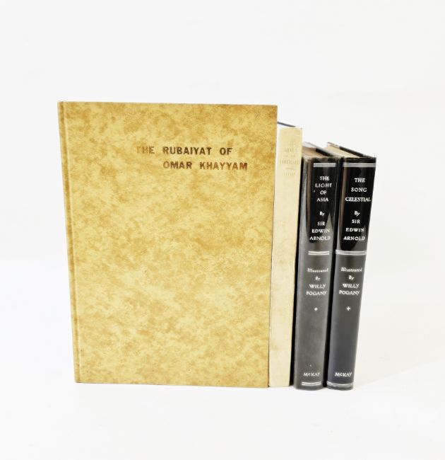 Pogany, Willy (ills) "The Song Celestial or Bhagavad-Gita ...", translated from the Sanskrit text by Sir Edwin Arnold, David McKay Company 1934, black and white plates throughout, pictorial boards with silver frame, glassine cover, "The Light of Asia or the Great Renunciation" by Sir Edwin Arnold, David McKay 1932, numerous black and white plates throughout, pencil comments on ffep, pictorial cloth with silver frame, "The Mimes of the Courtesans, Lucian", privately printed the Press of Classic Lore 1928, illustrated by Charles Cullen, no.630/1050 autographed copies by the artist, marbled ep, deckled edges, quarter vellum with blue boards and "The Rubaiyat of Omar Khayyam" [1972], numerous colour plates, decorations, the text in English and Arabic, library plate, mottled boards with gilt titles (4)