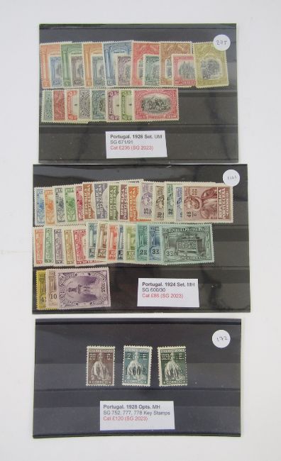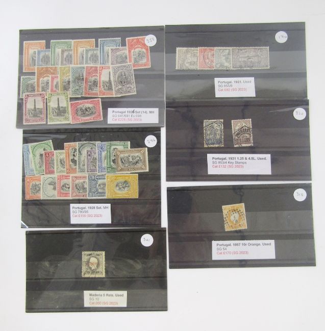 Stamps of Portugal: Various higher catalogue value issues on 9 stock cards from 1867 10r orange definitive to 1931 5th Fifth Death Centenary of Nuno Alvarez Pereira commemorative key values, includes 1924 Camoens, 1926 1st and 1928 3rd Independence commemorative mint sets. In addition, Madeira 5 r black, SG 10. SG cat c£1200.