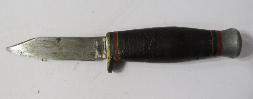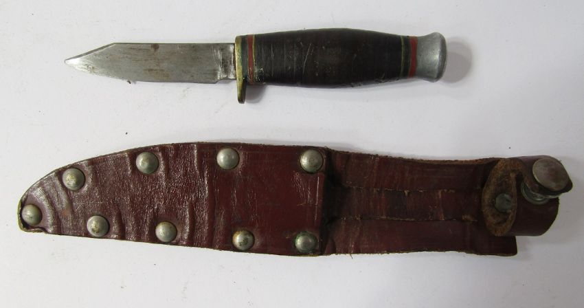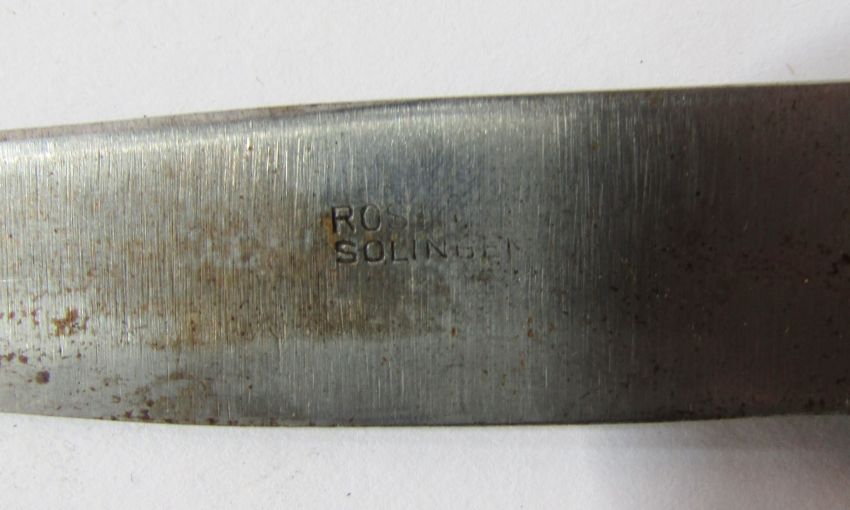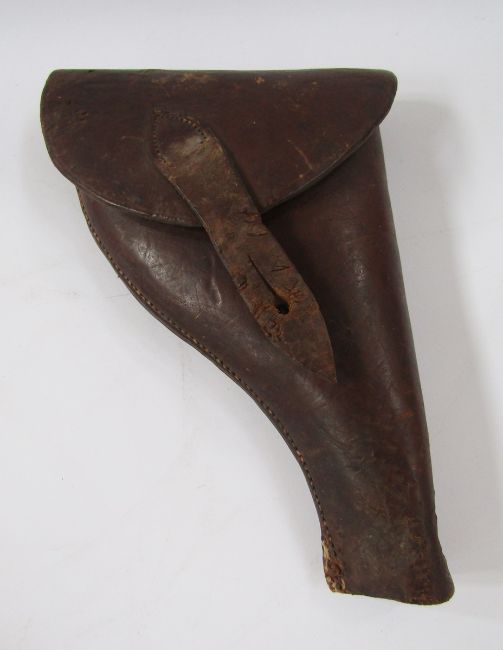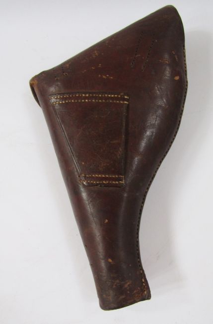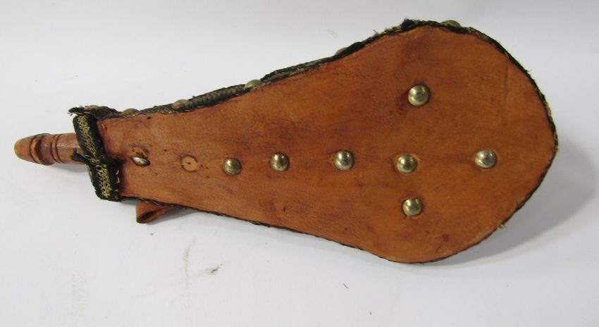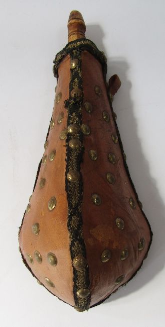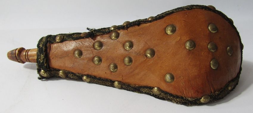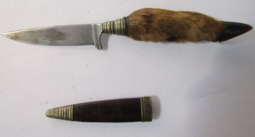 German Solingen hunting knife with deer foot handle, small hunting knife, leather revolver holster and leather powder flask.