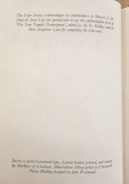 Shakespeare, William, 40 miniature volumes published by Allied Newspapers Ltd, all with engraved frontis, marbled ep, original leather binding (not checked for duplicates)  The Folio Shakespeare "Hamlet" 1954, "Macbeth" 1951, "Othello" 1955, "As You Like It" 1953, with designs for costumes by Salvador Dali, all four volumes have their dust wrappers, some chipping and loss (4 and small box)
