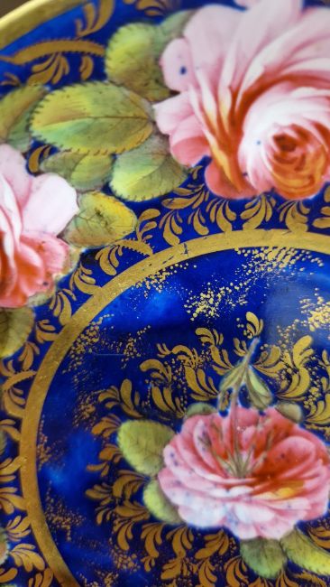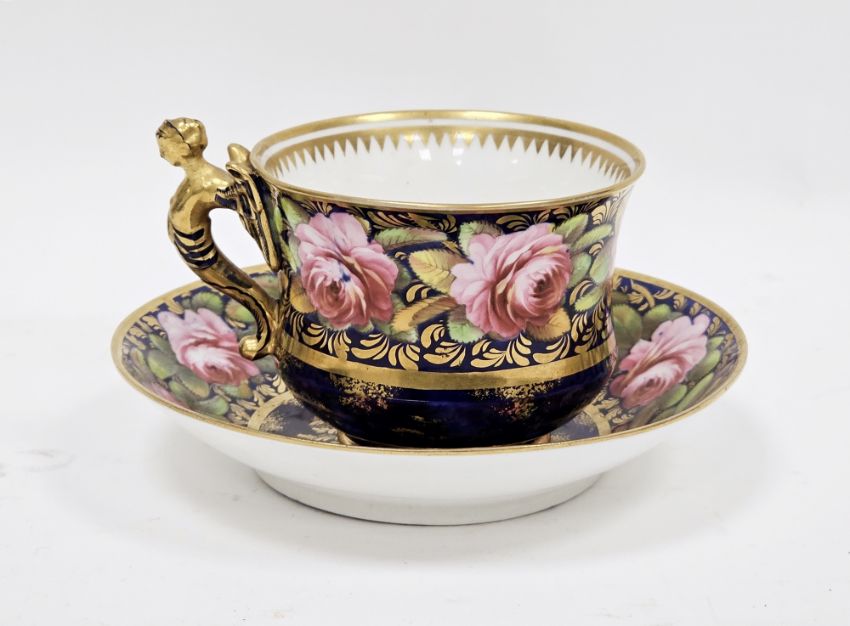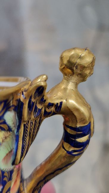 The winged female headed handle, cracked through neck, restuck and regilt. Overall Good overall condition, there is some light surface scratches, accretions, very minor wear to gilding on both and enamels.