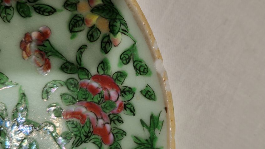 One imari bowl with chips to rim and wear. Celedon glazed plate with chips to the edge, wear to decoration, firing cracks to edge and underside. Other bowls with wear to decoration and gilt. Lamp in overall good condtion, no signs of damage, some surface marks and accretions. General wear and tear.