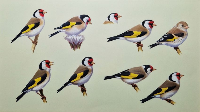20th century school Two ornithological studies, gouache on paper  The first with studies of goldfinch, 30.5cm x 17.3cm, the second with studies of golden oriole, 33cm x 20.5cm (both unsigned) (2)