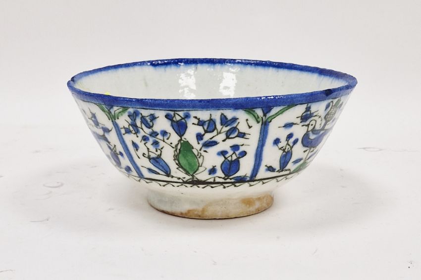 A Persian (Kashan) pottery bowl, 18th-19th century, painted with birds and foliage within panels, enriched in blue and green and outlined in black (rim chipping) 19cm. diam.