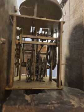 All clocks and watches are sold as untested for time keeping accuracies. Glass lenticle is possibly a later replacement. Comes with pendulum and one weight. Surface marks, scratches and wear in places commensurate with age and previous use.
