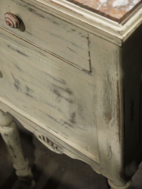 Two late 19th/early 20th century marble-topped pot cupboards, both later cream painted, each with a single drawer over a cupboard door and raised on turned tapering legs, largest 37cm wide x 37cm deep x 84cm high (2)  Condition Report Wear and distress throughout. Crack, small loss and chip to the corner of the marble of the smaller example. Broken knob to other. Scracthes, losses to paint etc. Please see additional photos.