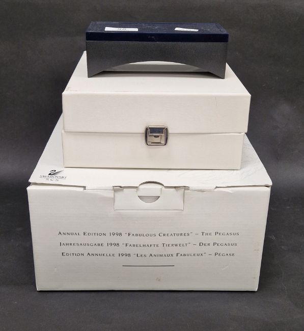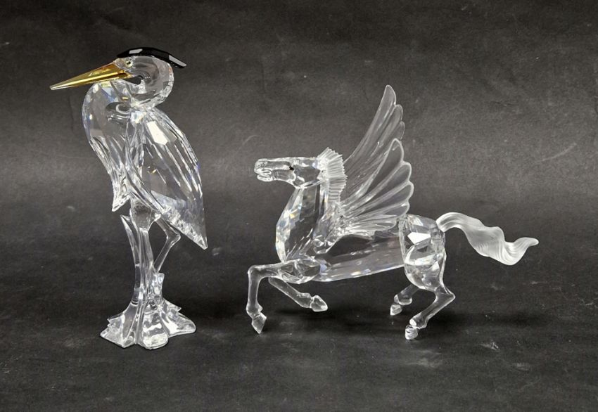 Swarovski ‘ Fabulous Creatures, the Pegasus ‘ annual edition 1998 with stand together with Swarovski silver crystal grey heron 221627, both in their original boxes (2)