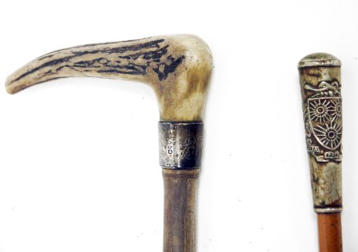 Victorian hunting crop with antler handle and silver ferrule, London 1885, Henry Howell & Co (lacking lash) together with a military swagger stick with malacca shaft