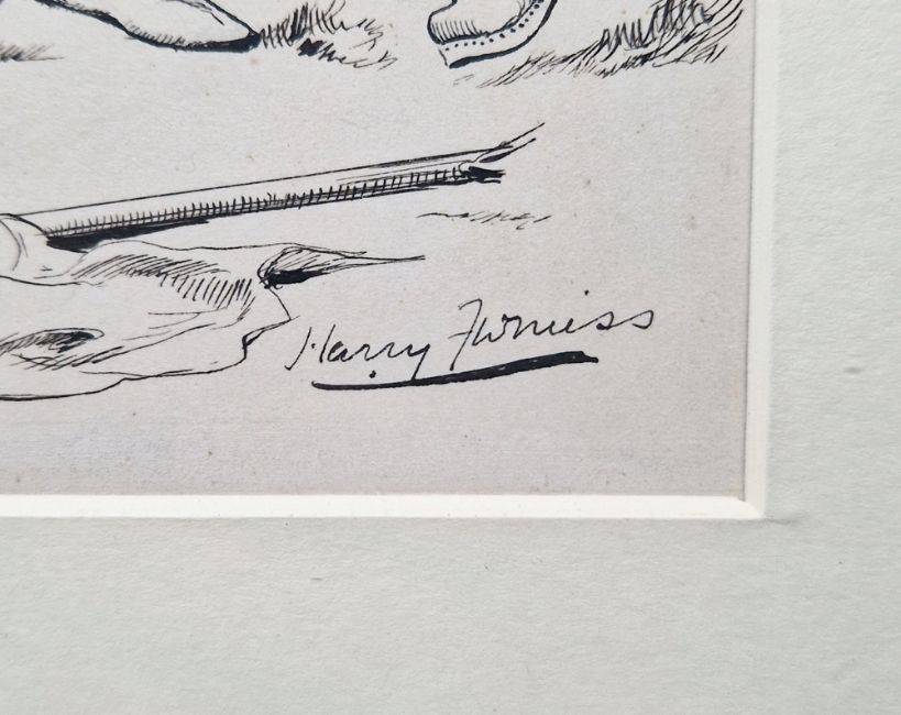 Harry Furniss (1854-1925) Pen and ink Historical cartoon depicting two men in a fight, one with the other in a headlock, in the background two horses, one in armour being held by a footman the other with its ears back, signed lower right, mount aperture 18 x 11 cm, framed and glazed (41 x 31 cm) typewritten note verso 'Copy of inscription in pencil to back of drawing' between Grosvenor and Jack Feeny
