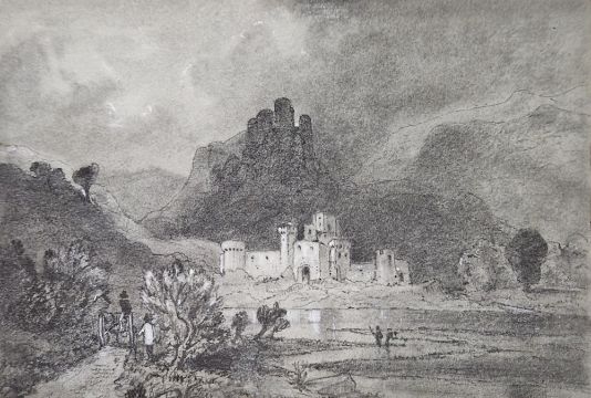 Attributed to Thomas Gambier-Parry (1816-1888) Pencil, wash, heightened in white, on paper Three lake landscapes, each with figures before castles and ruins, one with boats, mounted, unframed (unsigned), 24cm x 15.5cm (3)