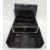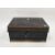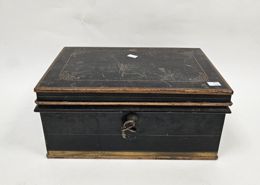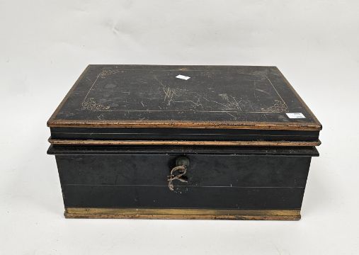 Victorian ' Milners ' black metal and gold colour painted cash tin, the hinged lid opening to three lidded compartments lifting out to a hinged tray, the two loop carrying handles stamped Milners, with key, 42cm wide
