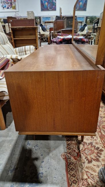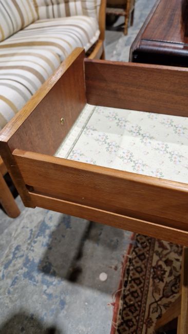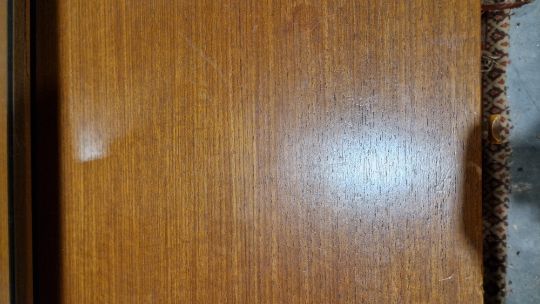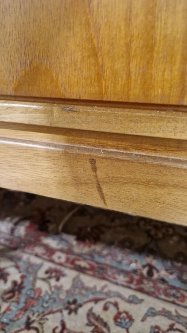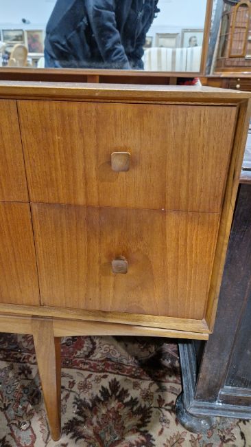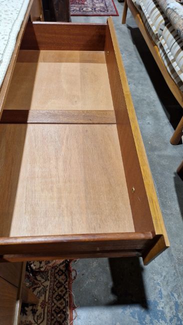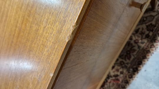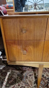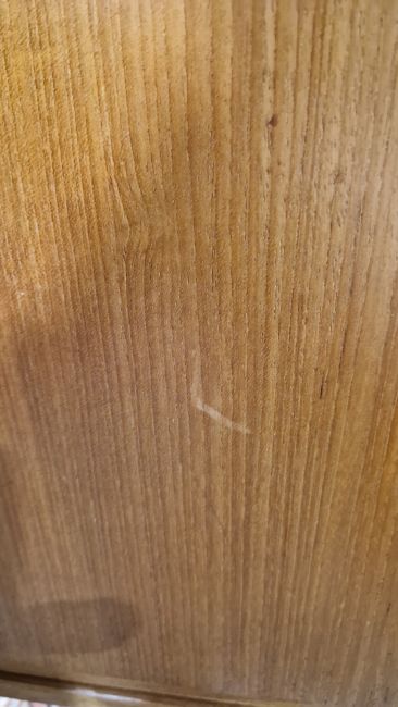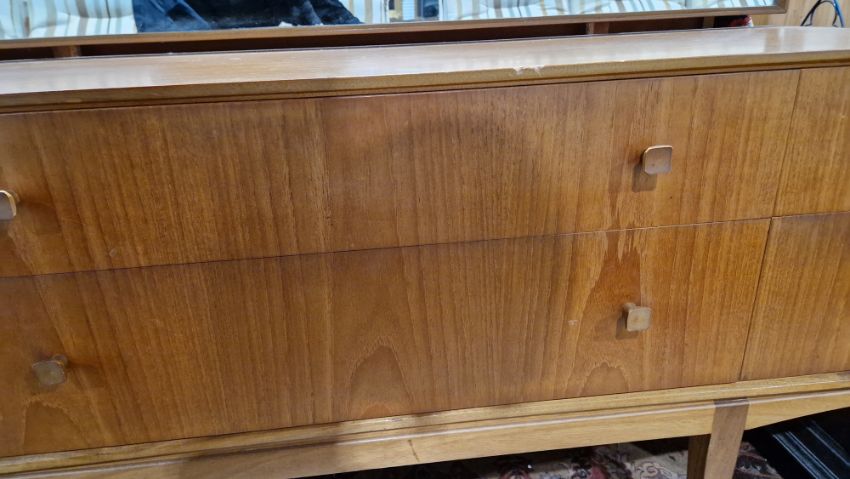 Surface scratches, scuffs and knocks. Areas of fading/discolouration and some stains/water marks to top. Drawers open and close smoothly, structurally solid. General wear and tear.