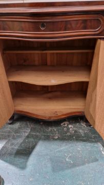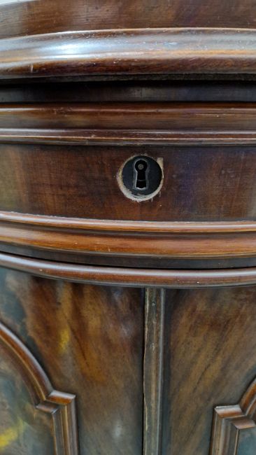 Surface scratches, scuffs and knocks. Fading/discolouration in places. Escutcheon missing from drawer. Area of loss to beading on right door. General wear and tear.