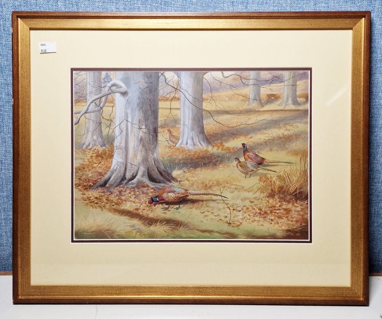 Philip Rickman (1891-1982) Watercolour Pheasants in woodland, signed lower right, framed and glazed, image size 26.5cm x 37cm