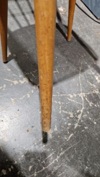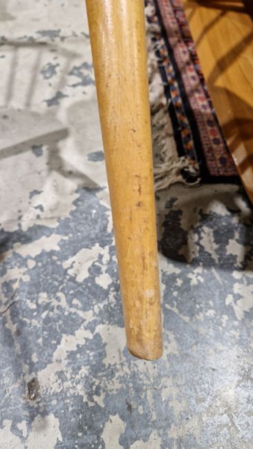 Surface scratches, scuffs and knocks. Areas of fading, discolouration and wear to varnish, white spots/water spots to seats. Accretions and white paint splaches on some. One stretcher sction is broken and with poor repair. Small split to the base of one stick. No woodworm. General wear and tear.
