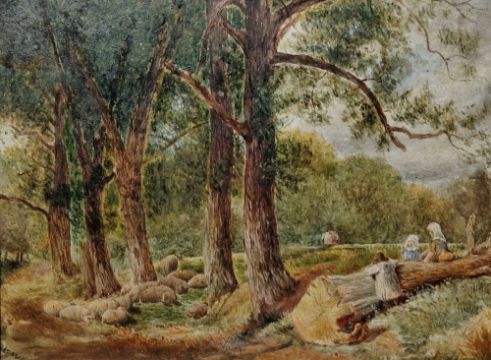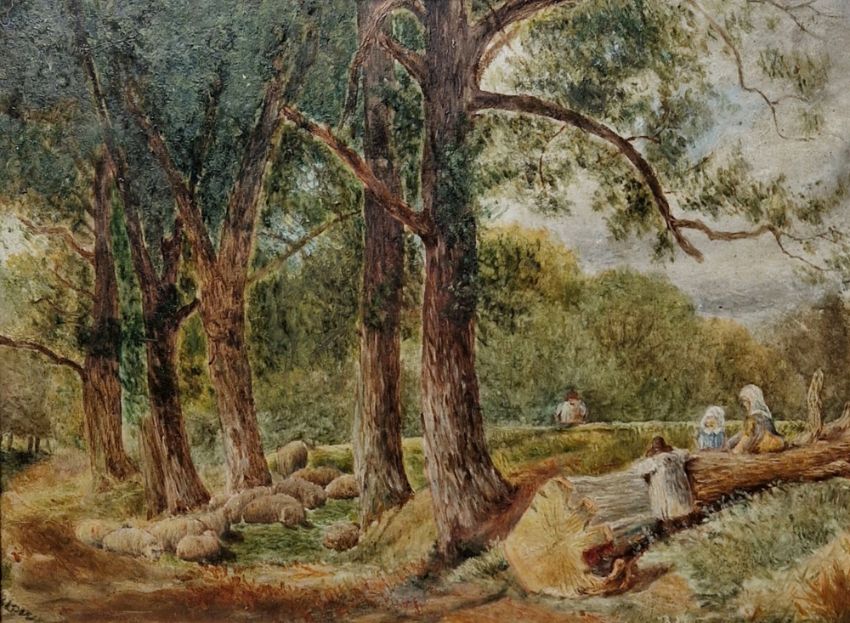 W. Lowe Oil on board 'A Surrey Lane', woodland scene with figures near fallen tree and sheep resting, signed lower left, framed and glazed, image size 20.5cmx x 28cm Property of Dunkirk Manor, Theescombe, Stroud