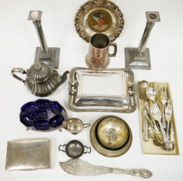 Pair of silver plated candlesticks raised on square pedestal bases, 26cm high, a Victorian silver plated cigarette box, a silver plated lidded serving dish, a Victorian teapot, etc
