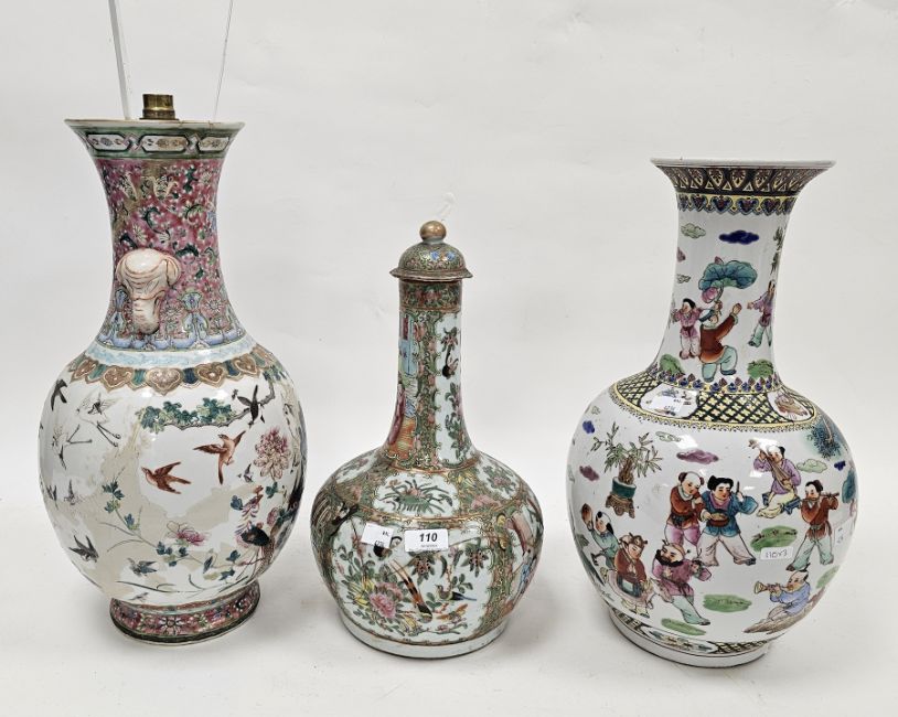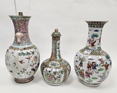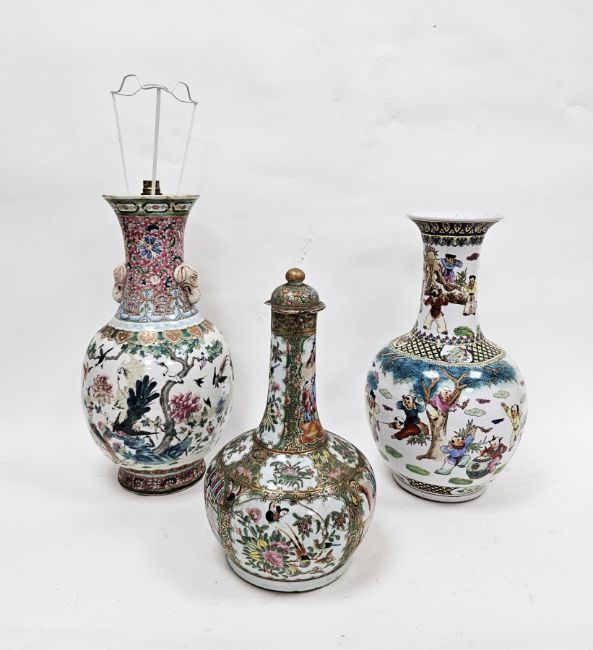 Chinese Canton famille rose bottle vase and cover, 19th century, painted with figures in an interior and panels of birds, butterflies and flowers 37cm high, a 19th century Chinese famille rose baluster vase with elephant handles, painted with pheasant, birds and flowers, drilled and adapted as a lamp, another later, decorated with figures, flowers and plants (damages and restoration overall)  Property of Dunkirk Manor, Theescombe, Stroud Condition Report Chinese Canton bottle vase and cover - with large rim chips to rim of cover, the vase extensively cracked and restuck and repaired all of the way around the body. Some minor wear and flaking to gilding. Chinese oviform vase with elephant handles, now drilled to lower part of body and adapted as a lamp, extensively cracked around body and neck and restored, with discoloured overpainting, inner rim of neck cracked and overpainted. Modern Chinese (Made in China marked) bottle shaped vase - some wear overall, minor glaze scratching.
