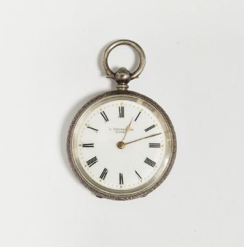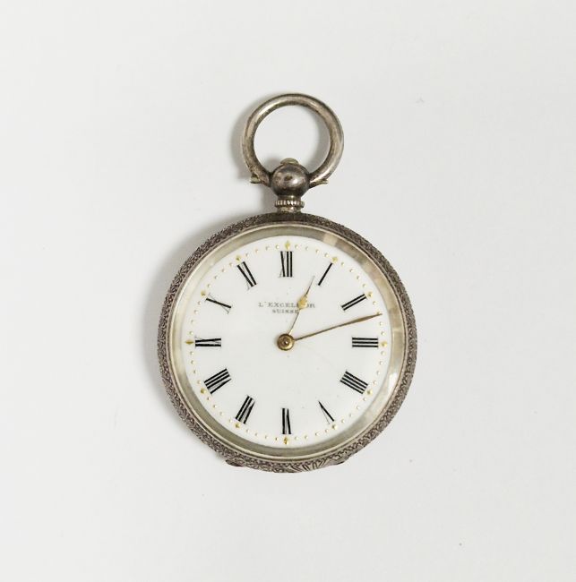 Early 20th century white metal cased Swiss fob watch by L'Excelsor, the enamel dial having Roman numerals, case back stamped 935, together with an Accurist lady's wristwatch with silver case and bracelet and a lady's Waltham (3)