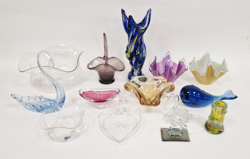 Collection of glassware, including: a Wedgwood  blue glass whale paperweight, a Paul Kedelv for Flygfors (Sweden) pink and white cased Coquille small vase 13cm wide, etched marks, dated '69, a Whitefriars Sapphire blue glass swan, two Chance handkerchief vases, a Swarovski crystal swan and other items