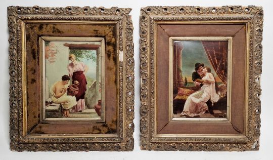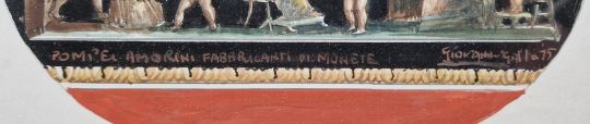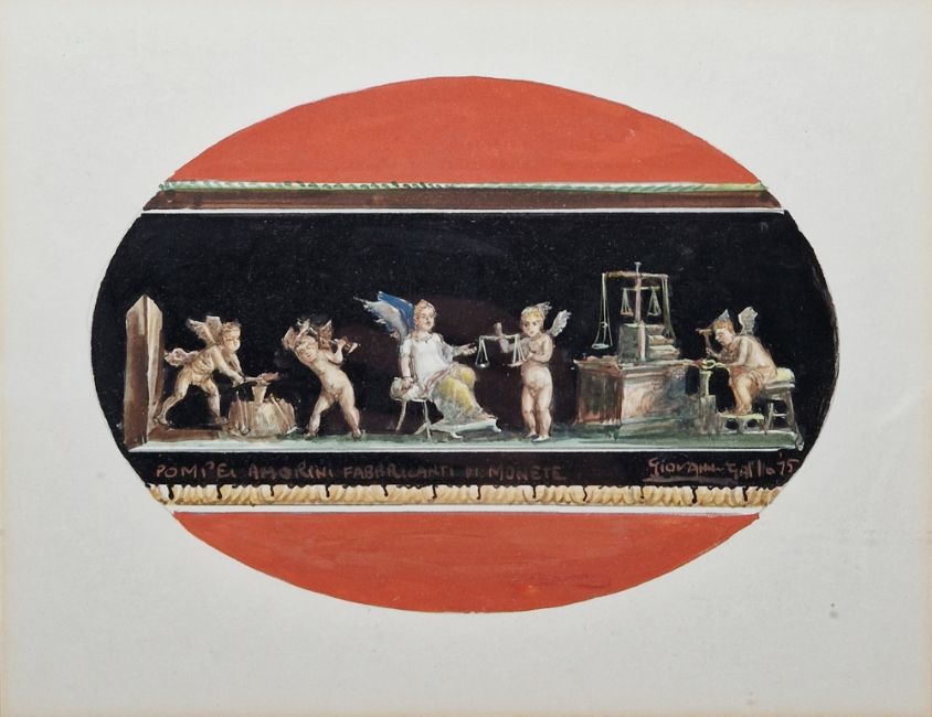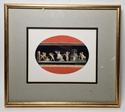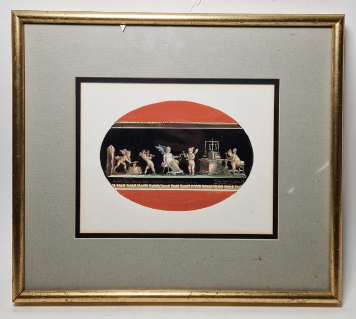 "The Lake, Gordon Castle", signed lower left, artists label verso, framed and glazed, mount aperture 28cm x 25cm, together with Giovanni Gallo (b.1942), gouache drawing "Pompei Amorini Fabbricanti di Monete", signed and dated 1975 lower right, framed and glazed, mount aperture 17.5cm x 22.5cm and two crystoleum pictures with ornate giltwood and gesso frames (4)
