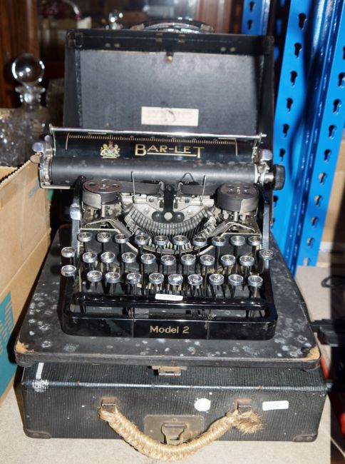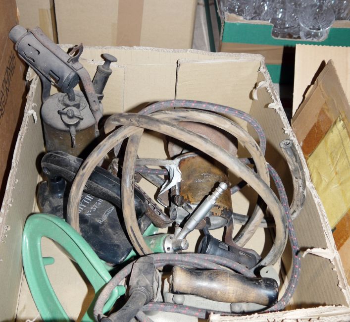 Large lot of collectable items including vintage Bulmer duplicator, two vintage typewriters, Elite Boy 500 radio, Renaddress addressing duplicator with instructions, blow torches, flat irons, etc