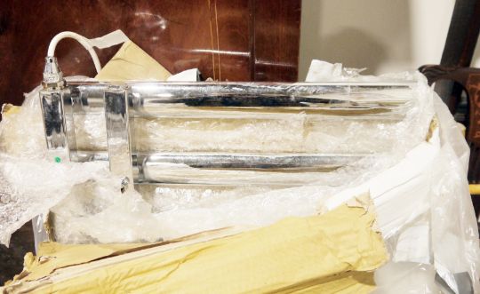 Chrome-effect heated towel rail/radiator, unused and still in original wrapping, 50cm wide x 125cm high approx.