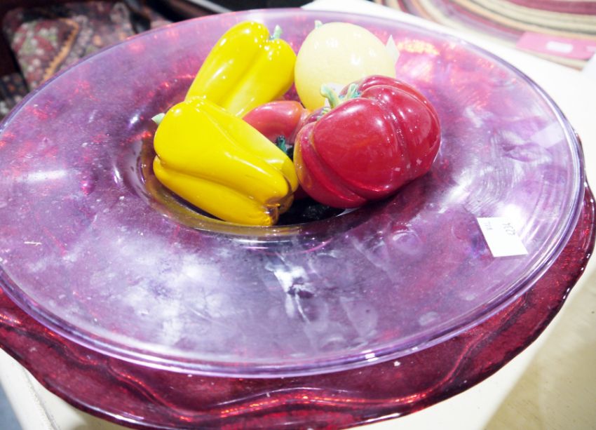 Ornamental glass peppers, Wedgwood Jasperware coffee pot, assorted tureens, two large glass platters, a mirror with facet cut glass frame and other items (2 boxes)