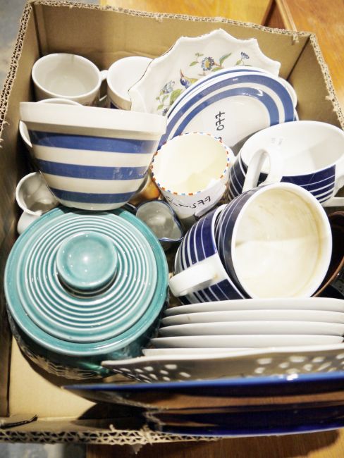 Wedgwood embossed Queens ware part service, Duchess part tea service, Aynsley vase, Staffordshire pottery 'Cordon Bleu' plates, an Andrew mantel clock, various vintage handbags (3 boxes)