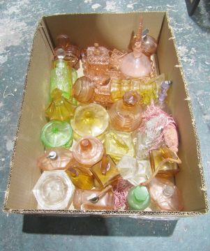 32 early 20th century clear and coloured moulded glass perfume bottles, dressing jars, atomisers, trays, etc