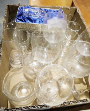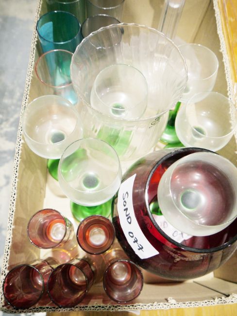 Four boxes of assorted glassware to include wines, sherries, Irish coffee, vases, decanters, etc, a Mdina glass paperweight, two other Art glass vases, cranberry glass vase and cranberry glass small flutes, moulded glass bowls and blue opaque glass dessert suite of serving bowl and six dishes (4 boxes)
