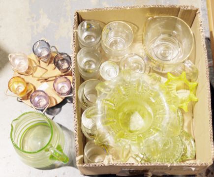 Collection of glassware including cut glass drinking glasses, uranium glass items, a clear glass decanter, a mid 20th century water set, etc